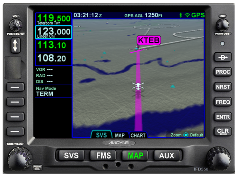 Los sistemas IFD550 de Avidyne proporcionan navegación GPS/FMS con todas las funciones, comunicación y navegación VHF integradas y una interfaz de usuario táctil híbrida que ofrece a los pilotos lo mejor del funcionamiento con pantalla táctil, incluso con guantes, junto con mandos y botones específicos para un control sencillo en todas las fases del vuelo. Los IFD550 incluyen cartas electrónicas de aproximación y diagramas de aeropuerto/helipuerto georreferenciados de Jeppesen y conectividad inalámbrica integrada. Además de un sensor de referencia de actitud (ARS) integrado, que detecta el movimiento de cabeceo y balanceo y permite la visualización de visión sintética tridimensional dinámica (SVS) con vistas tridimensionales de movimiento completo “fuera de la ventana”, así como vistas exocéntricas “dentro de la pista” de la aeronave y el terreno cercano, obstáculos, tráfico y terreno. El HTAWS integrado opcional y las capacidades de visualización de vídeo RS-170 proporcionan seguridad y utilidad adicionales para los operadores de helicópteros.