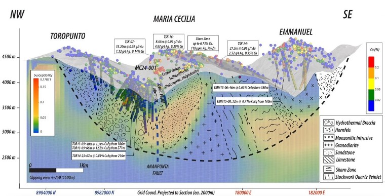 El primer sondeo de exploración en María Cecilia MC24-001 está situado en una zona de afloramiento de óxidos de cobre con leyes de hasta 0,7% Cu.  El sondeo se orientó hacia el borde NO de la anomalía magnética geofísica, Pórfido 1, alcanzando una profundidad total de 696 metros, incluyendo continuidad anómala de cobre a más de 234 m de la superficie con leyes de 0,08% Cu principalmente en vetillas con calcopirita y diseminadas después de los primeros 40 m de perforación.  La perforación en superficie interceptó inicialmente óxidos de cobre negro (tenorita).