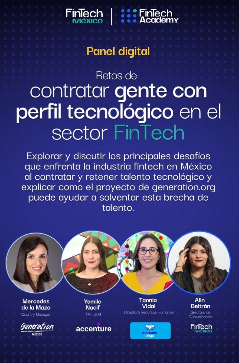 En el panel digital organizado por FinTech México, líderes del sector discutieron las barreras para atraer y retener talento. Mercedes de la Maza, CEO de Generation México; Yamile Nacif, HR Lead en Accenture México; y Tannia Vidal, Directora de Recursos Humanos de Mercado Pago, abordaron los retos que enfrentan las empresas para encontrar profesionales con las competencias tecnológicas que demanda el mercado actual.